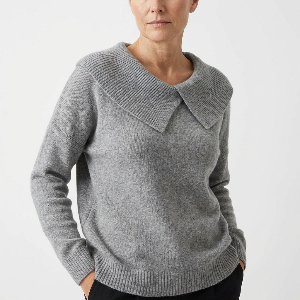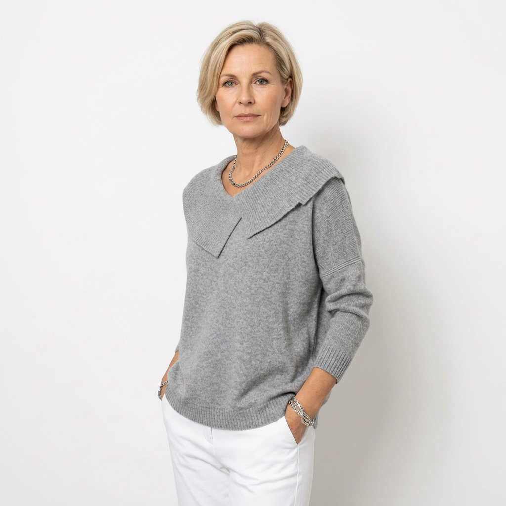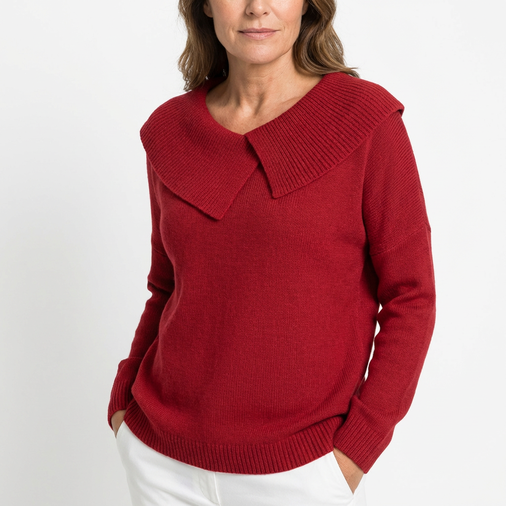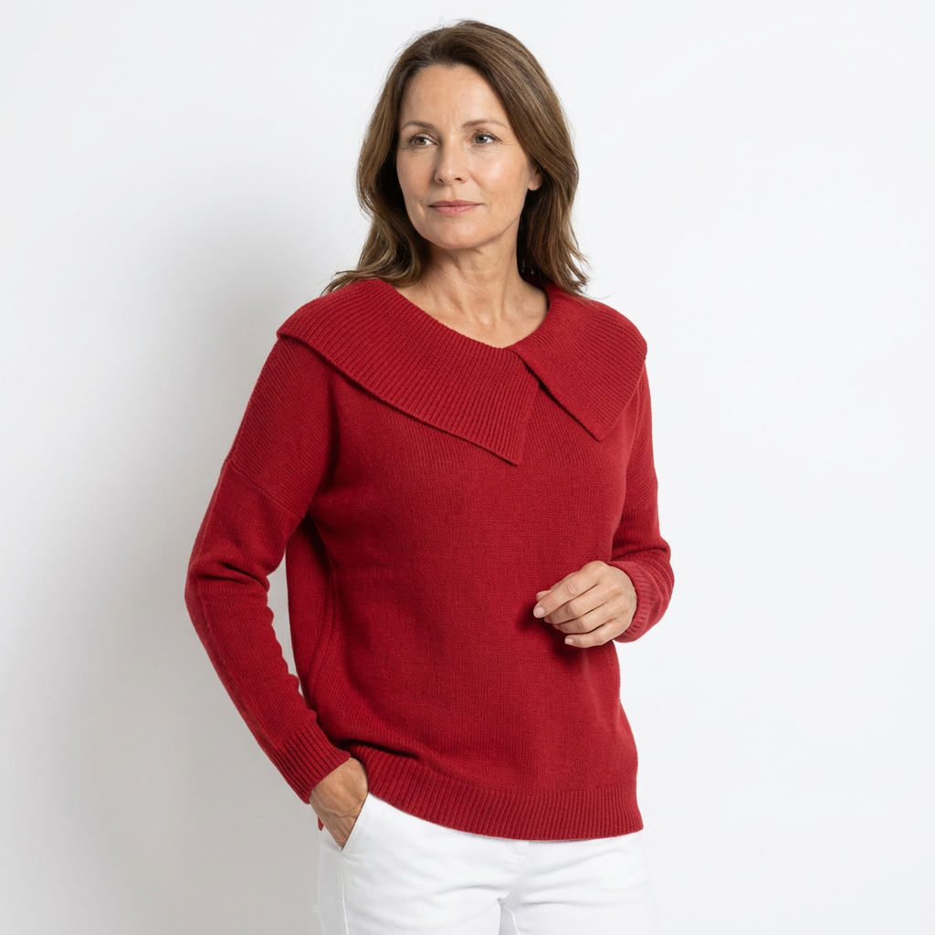 Der weiche Kragen mit dekorativer Falte umrahmt sanft das Dekolleté und verleiht eine elegante, feminine Note, ohne je übertrieben zu wirken. Die warme, weiche Strickverarbeitung umhüllt den Körper mit Leichtigkeit und schenkt ein angenehmes Wohlgefühl, das den ganzen Tag anhält.