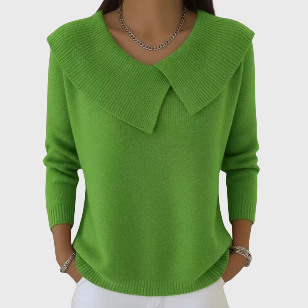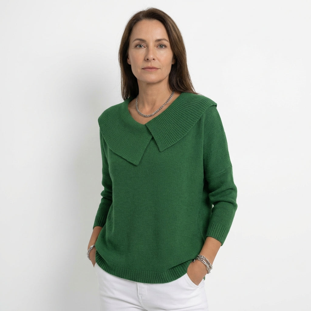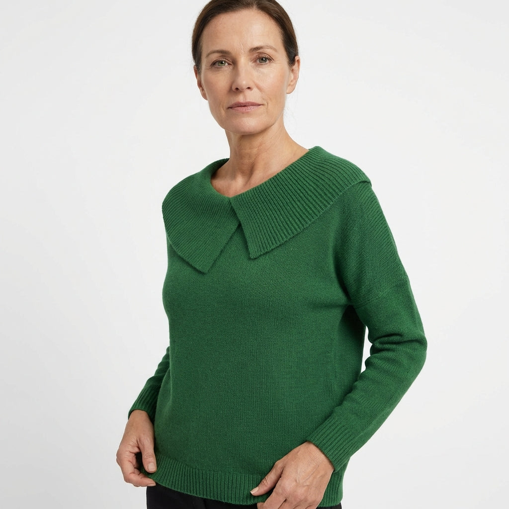 Der weiche Kragen mit dekorativer Falte umrahmt sanft das Dekolleté und verleiht eine elegante, feminine Note, ohne je übertrieben zu wirken. Die warme, weiche Strickverarbeitung umhüllt den Körper mit Leichtigkeit und schenkt ein angenehmes Wohlgefühl, das den ganzen Tag anhält.