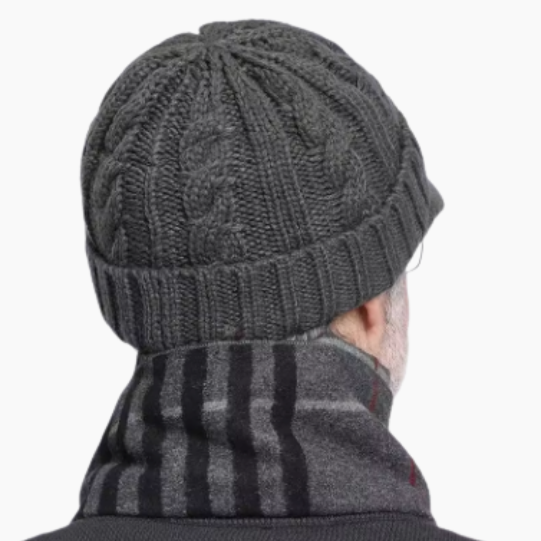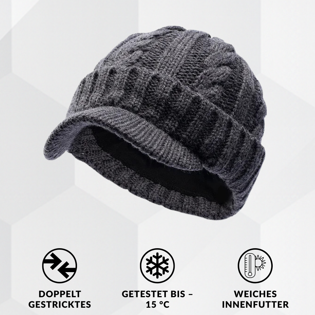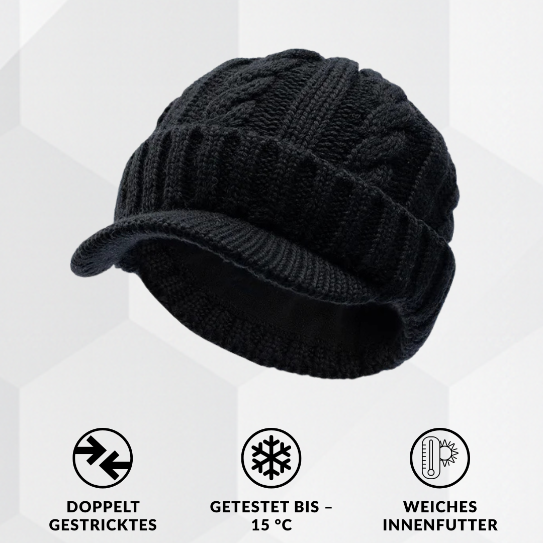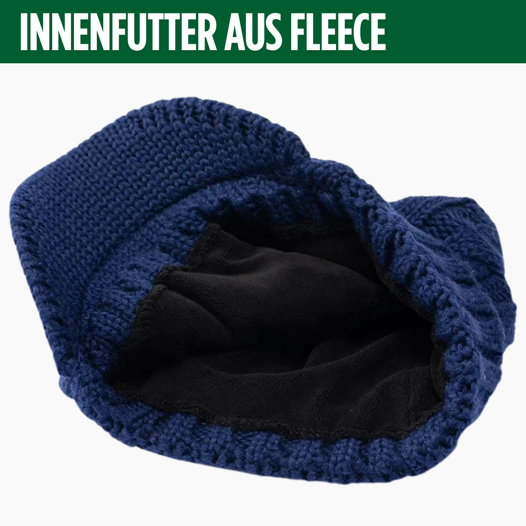 Das besonders dicke, doppelt gestrickte Material speichert die Wärme effektiv, während das weiche Innenfutter für ein angenehmes Tragegefühl sorgt. Die Mütze liegt sanft auf der Haut, kratzt nicht und bleibt auch bei längerem Tragen bequem.